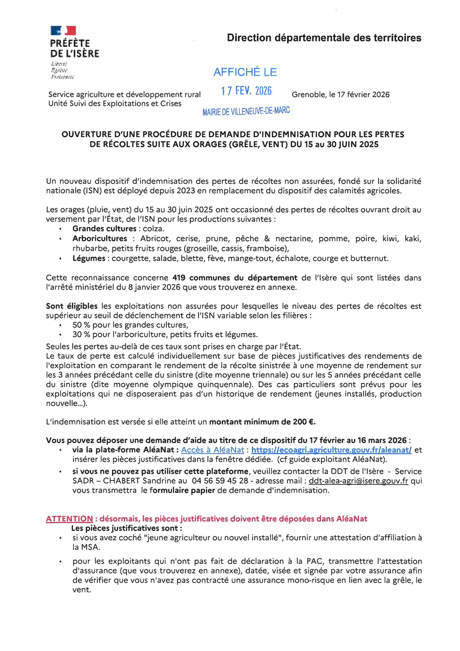 Ouverture d'une procédure de demande d'indemnisation pour les pertes de récoltes suite aux orages du 15 au 30 juin 2025
